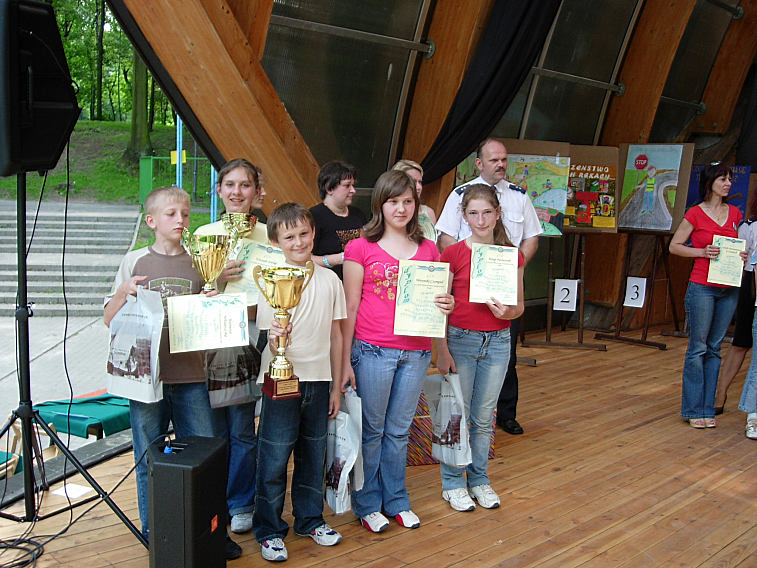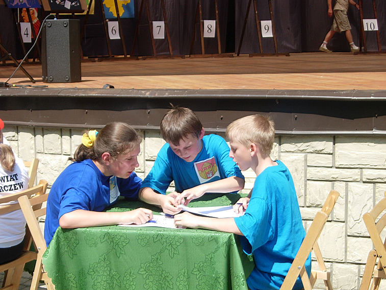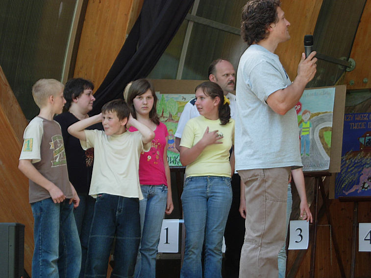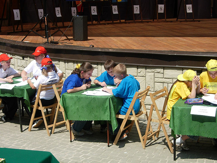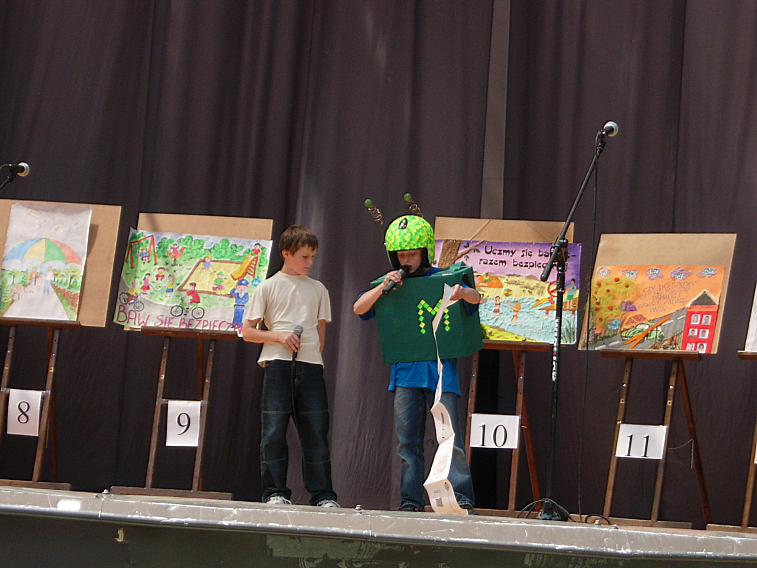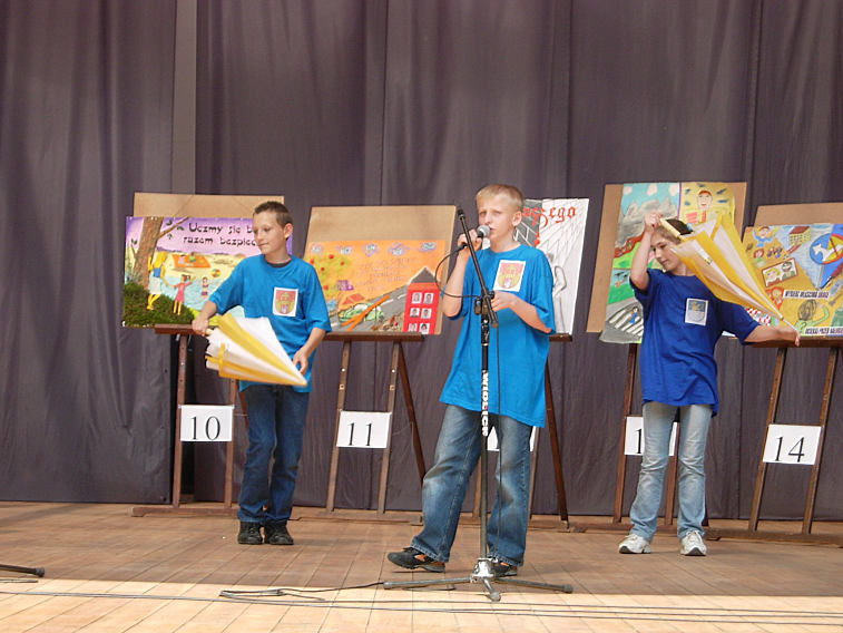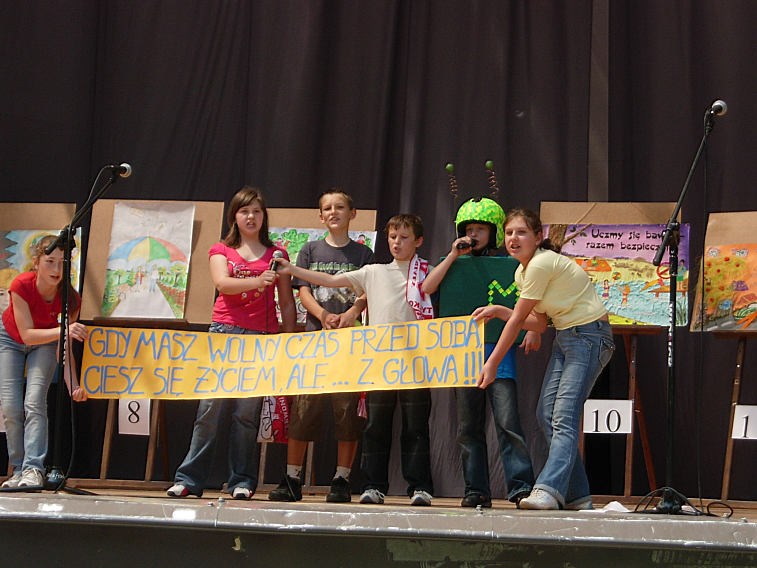 Pierwsze zadanie konkursowe polegało na oryginalnym zaprezentowaniu szkoły, miejscowości oraz uczestników turnieju. Pomysły na oczarowanie sędziów były bardzo różne. Zobaczyliśmy prezentacje w stylu poważnym i wesołym, ludowym i sportowym, nowoczesnym i historycznym. Drużyna z Józefowa nad Wisłą podbiła serca jurorów tańcem piosenką i dużą porcją dobrego humoru. Komisja konkursowa wysoko oceniła również nasz plakat (konkurencja nr 2), ukazujący zagrożenia związane z narkomanią wśród młodzieży. W kolejnej konkurencji, którą był test wiedzy, nie mięliśmy sobie równych. Mateusz, Daniel i Ula jako jedyni odpowiedzieli bezbłędnie na wszystkie pytania, uzyskując maksymalną liczbę punktów. Potwierdzeniem naszej klasy była ostatnia konkurencja "Bezpieczne hasło", w której pokazaliśmy jak przeciwdziałać nawet najbardziej "kosmicznym" pomysłom, jakie przychodzą do głowy młodym ludziom.